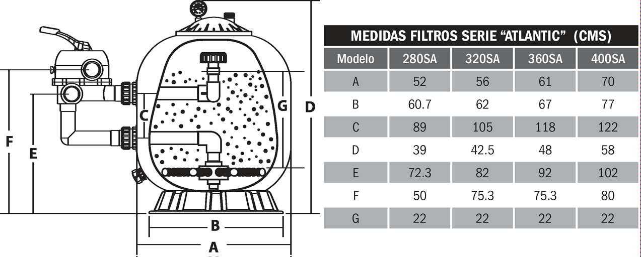 | FILTROS SERIE “ATLANTIC” DE FIBRA DE VIDRIO Y VÁLVULA LATERAL / INTER WATER | |||||||||