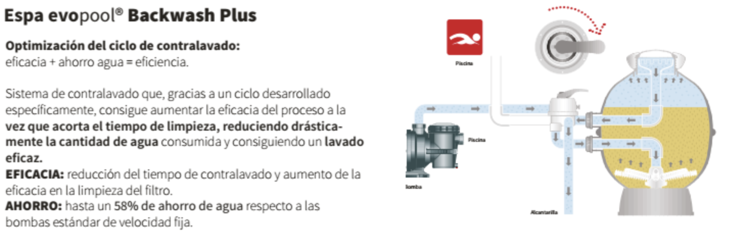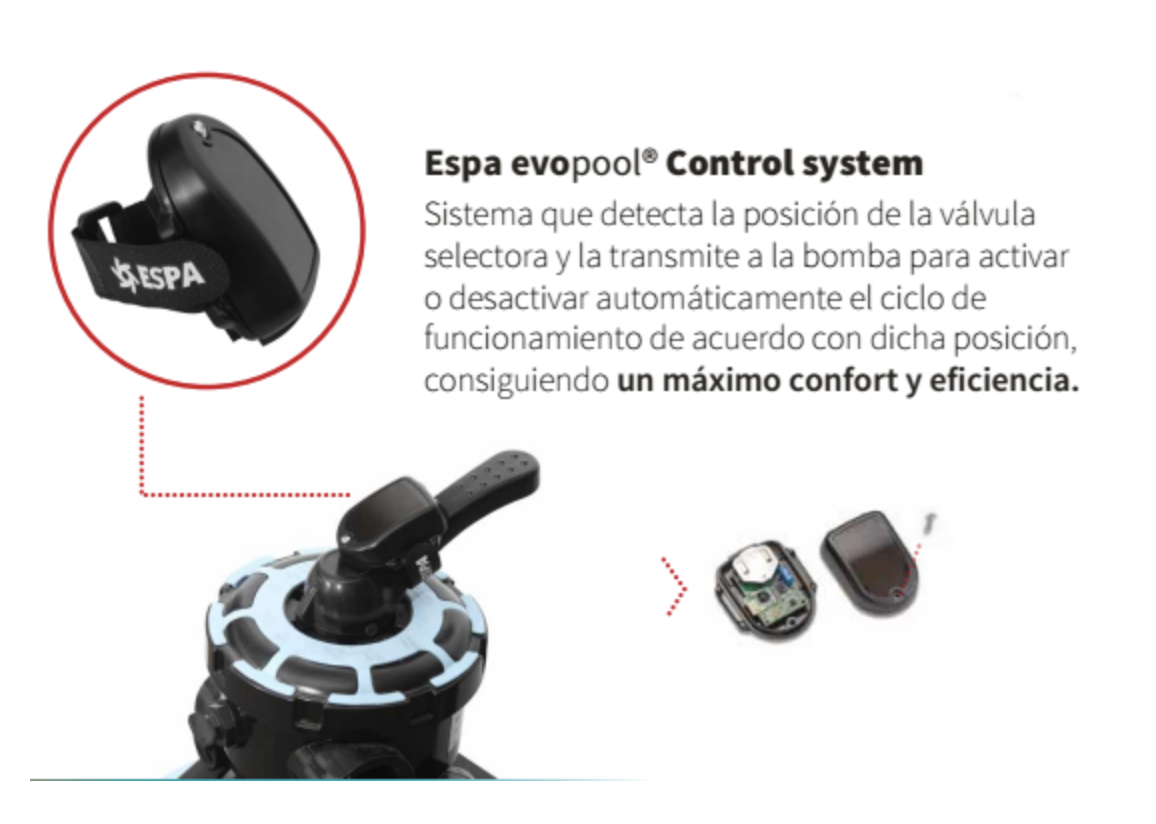 La bomba para piscina SILENPLUS incorpora el diseño innovador de un variador de frecuencia junto con el sistema más avanzado de control inalámbrico, logrando revolucionar el sistema de filtrado en las piscinas, cumpliendo con la fórmula perfecta de eficiencia y ahorro. Gracias a la función “Control system” se obtiene una mejor automatización en el sistema, ya que detecta la posición de la válvula selectora y la transmite a la bomba para activar o desactivar automáticamente el ciclo de funcionamiento de acuerdo con dicha posición. Además se puede tener la bomba bajo control total desde un smartphone con “ESPA evopool App”, una aplicación que simplifica el uso, control y parametrización de la bomba, tiene la opción de programar un horario semanal y cuenta con una herramienta de cálculo de ahorro energético.